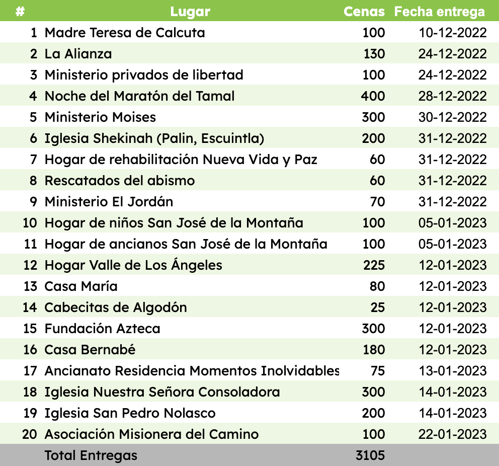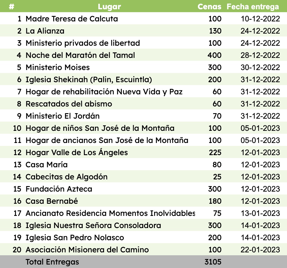 En 2022 el Maratón del Tamal logró superar su meta recaudando 3,105 cenas que se entregaron en conjunto a 19 organizaciones. Un punto importante es que retomamos nuestro recorrido en las calles de la ciudad de Guatemala entregando 400 cenas a indigentes, personas que se encontraban en la espera de las áreas de emergencia de los hospitales nacionales y servidores públicos. A continuación el detalle de las entregas realizadas entre el 10 de diciembre de 2022 y el 22 de enero de 2023.